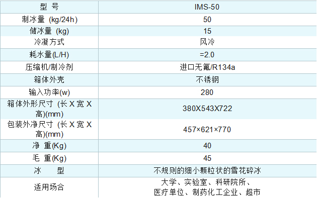性能特点1) 采用优质不锈钢外壳,防腐耐用,独立型一体式结构,紧凑简洁,节省空间。2) 箱体隔热层为无氟发泡,保温效果好,内胆为无氟抑菌型,节能环保。3) 采用优质高效R134a无氟压缩机,零部件均经SGS公司检测,符合欧盟RoHs环保指令要求。4) 所用电器安全零部件均有“TUV”或“VDE”安全认证,认证零部件,安全可靠。5) 制冰过程采用全电脑程序控制,进口电脑芯片, 控制可靠,运行平稳。6) 采用意大利技术的Haitec二级减速器,噪音低,运行平稳可靠。 制冰机顶部设有散热孔及风机,保证减速器电机在高温恶劣条件下也能可靠运行。7) 螺旋滚刀挤压式制冰型式,结构紧凑,实现冰、水自动分离。冰刀刃口的优化设计,使得所制冰形细小实用。8) 独特的水箱浮球式进水系统,保证无残水余水,无除冰过程、无水损耗,无殘水、节水节能。9) 有冰满显示,缺水显示,过冷保护显示,故障警告显示等保护性停机功能。制冰机冰满缺水时会自动停机,当来电来水时会自动开机,具有自动记忆恢复功能。10) 所制冰形为不定形的细小颗粒状雪花碎冰,冰形小,能渗入较窄间隙, 冷却速度快,冰浴效果好,专为实验室设计。11) 前部设有电源开关和功能指示灯,周到详细的操作说明,使用直观方便,各项安全指标均经电性能测试通过,安全放心。12) 出厂前长时间的制冰性能检测和调试,保证了产品卓越优良的性能。13) 雪花形冰广泛应用于医院、学校、实验室、科研所等场合以及超市食品保鲜、渔业捕捞冷藏、医疗应用、化工、食品加工等行业,应用范围广。