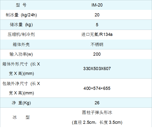 性能特点1) 不锈钢外壳,防腐耐用,外观简洁大方,自来水自动进水。2) 全电脑程序控制,制冰速度快、效率高,操作简便。3) 圆柱子弹头形冰,冰粒规整美观,透明程度好。4) 有冰满和缺水自动停机功能,通过欧洲CE认证。5) 高效无氟压缩机,经济节能。