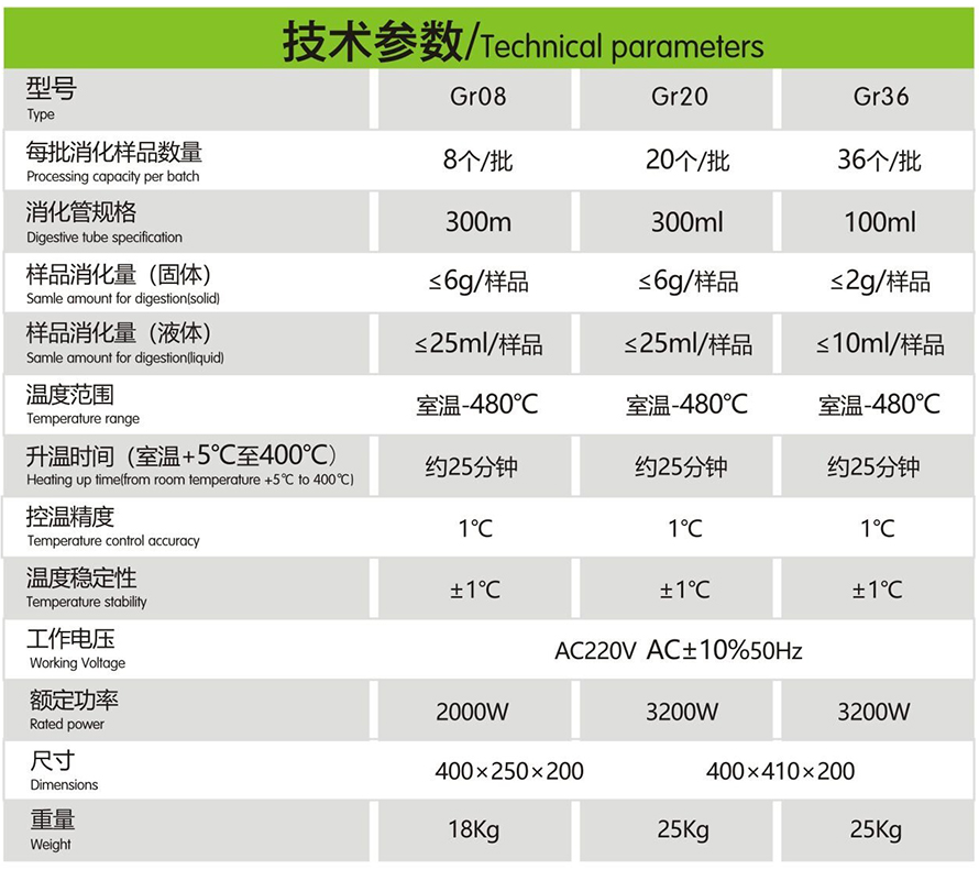 应用范围广泛适用于食品、医药、农业、林业、环保、化工、生物等行业以及高等院校、科研院所对土壤、饲料、植株、种子、矿石、 重金属、COD消解等样品前处理。· 氮与蛋白质样品消解消;COD解;· 总磷、砷检测等的样品前处理;· 重金属检测样品前处理(铅、铜、锌、锡等)。产品特点· 隔热方式:陶瓷以及风道隔热;· 加热方式:红外辐射及高纯石墨传导;· 可控温度恒定;· 具备过压、过流、过热、超温报警、故障自动报警;· 温度PID输出,控温精确,超温保护,使用安心;· 表面外壳喷涂特氟龙涂层,防止消解过程中对仪器的腐蚀;· 两种尾气吸收系统可供选择。
