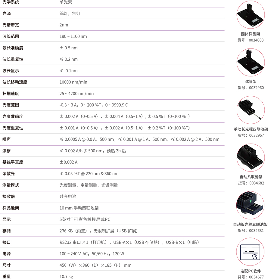 主要特点· 选用5英寸高分辨率TFT彩色触摸液晶屏,显示效果优异,反应灵敏。· 一体化压铸光学平台和全模具化塑壳,确保仪器长期稳定可靠。· 全新的波长驱动机构,大幅提高了波长精度和重复性,有效降低运行噪声。· 具备开机自校准功能和预热倒计时显示。· 抗腐蚀比色皿槽和特殊漏液孔设计,防腐能力更强,即使漏液也不会损坏仪器。· 可通过PC软件反控仪器;亦可直接连接打印机,直接输出测试结果。技术参数