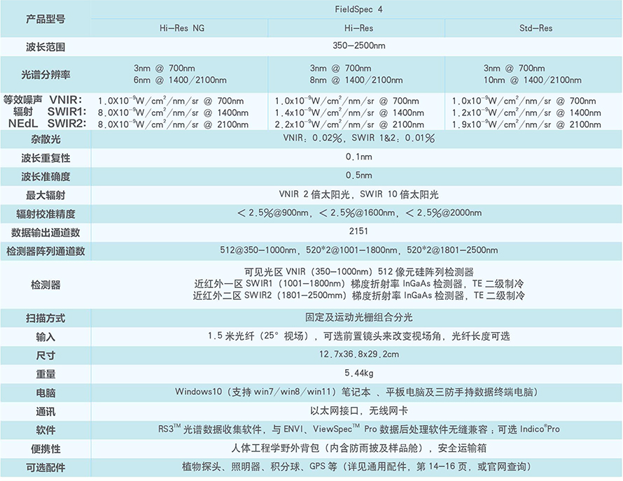 优点· 完全为野外遥感研究设计· 在太阳作为光源的情况下,同时拥有更高光谱分辨率和更低等效辐射噪声· 光纤与主机严格固定,一体定标,可溯源到美国NIST· 外形美观,坚固耐用,人体工学设计,使用体验舒适方便· 海量应用文献,数据库完备,无缝兼容 ENVI、TSG 等更多的第三方工具软件性能指标