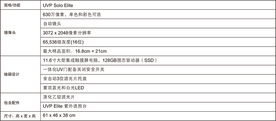 UVP Solo Elite是一个台式全自动凝胶成像系统,使用方便。 VisionWorks软件可用于采集和分析,用户通过一键成像功能即可获取凝胶图像。 UVP Solo Elite可进行常规的凝胶成像、分析和记录,为科研研究锦上添花。同事其设计小巧,可节省工作台空间,便于研究人员进行快速处理。UVP Solo Elite是您实验室的不二之选。 该成像仪采用一体化系统设计,配有11.6英寸的集成触摸屏电脑,630万像素高分辨率摄像头(有彩色或单色自动摄像头可供选择),三位滤光片托盘,标配置顶蓝光和白光LED照明以及UVP Elite紫外透射仪。