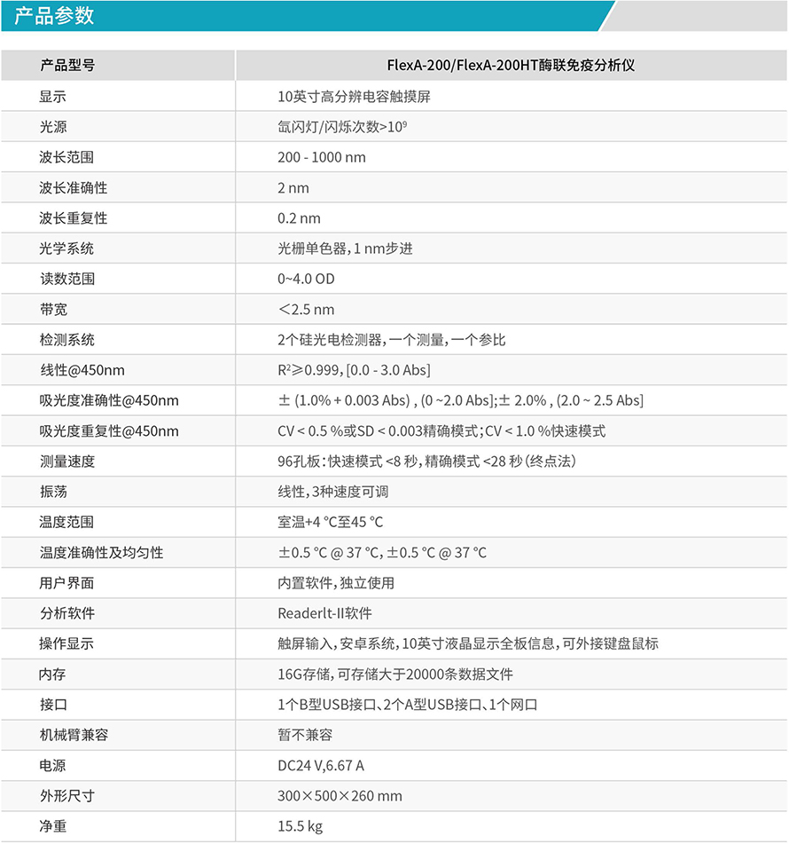 FlexA-200酶联免疫分析仪是一款基于光栅单色器,波长范围200-1000nm的高品质酶标仪。可用于光谱扫描、终点法和动力学检测。适用于带盖及不带盖的96孔板和384孔板。FlexA-200可进行微孔板振荡和培养,培养温度最高达45°C。FlexA-200酶联免疫分析仪既可通过仪器内置软件独立操作,又可使用Readerlt-II软件,通过PC电脑控制操作。