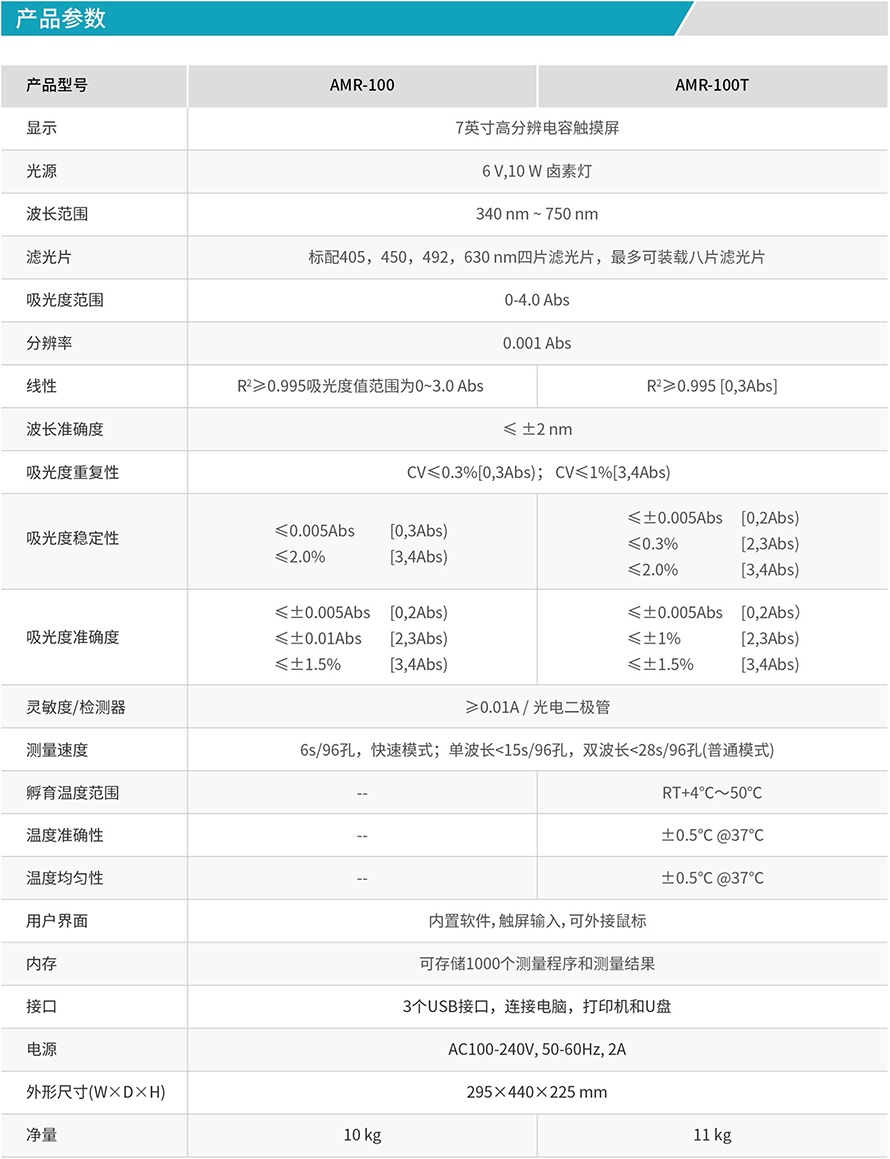 AMR-100/AMR-100T酶联免疫分析仪是基于滤光片的高品质光吸收酶标仪,波长范围340nm-750nm,适合科研和临床的应用。7英 寸触屏彩色液晶显示,无需操作键盘,简单易用。*AMR-100医疗备案证号:浙械注准20182400109*AMR-100T附加孵育功能,孵育温度范围为室温+4°C至50°℃。产品特点· 高分辨7英寸彩色触摸屏,操作便捷,无需操作键盘,简单易用;· 软件配置丰富,既可单机使用,也可与电脑连接,结果实时输出;· 吸光度范围:0.0~4.000 Abs,满足不同测量要求;· 8位滤光片轮,标配4片滤光片,可选配其他滤光片;· 内置软件可以提供仪器的控制和数据分析,可直接外接U盘;· 检测速度快,在6s内即可完成96孔微孔板整板检测;AMR-100酶联免疫分析仪特有优点· 高分辨7英寸触摸屏,操作简单直观,无需操作键盘;· 可视化布板,方便实用;· 酶标仪配备标准的控制和数据分析软件Readerlt-l,数据检测,方便快捷;· 强大的数据分析功能以及出色的结果报告,不仅可独立运行分析,也可在电脑上运行分析。