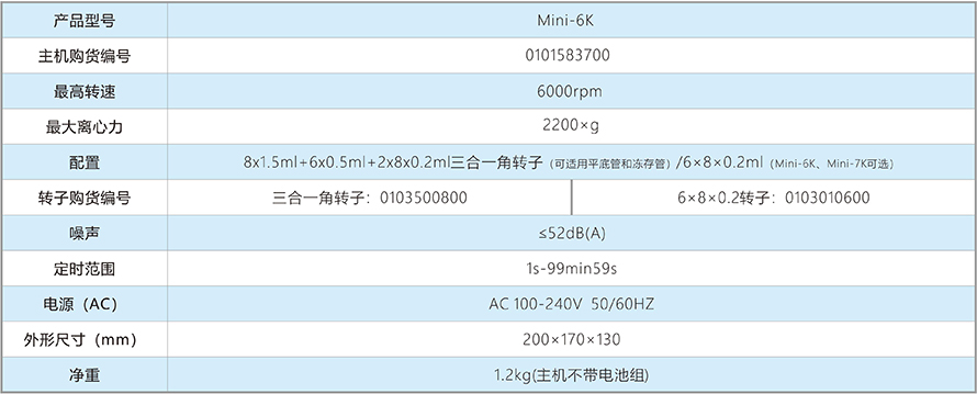 产品特点· 迷你离心机外形设计精巧,高强度工程塑料模具一次成型· 采用BLDC无刷电机驱动,超低噪声,运行平稳· 数字显示,采用单片机闭环控制,实时测速,转速精度高· 升速时间可调,可灵活适应不同实验离心收集需求· 有电子刹车功能,能实现3秒停机,节约实验时间· 门盖保护,开盖自停,确保安全· 转速从800-最高转速可调,时间1秒-99分59秒可调· 采用AC100-240V宽范围电源输入,能适应不同实验环境· 可选装锂电池组,无需外接电源实现户外离心实验(选装)· 标配三合一角转子(8x1.5/2ml+6x0.5ml+2x8x0.2ml),无需更换转子和适配器便能实现2.0ml、1.5ml、0.5ml、0.2ml· 8联管的同时离心· 适用于实验中低速微量管的沉淀和离心主要技术参数