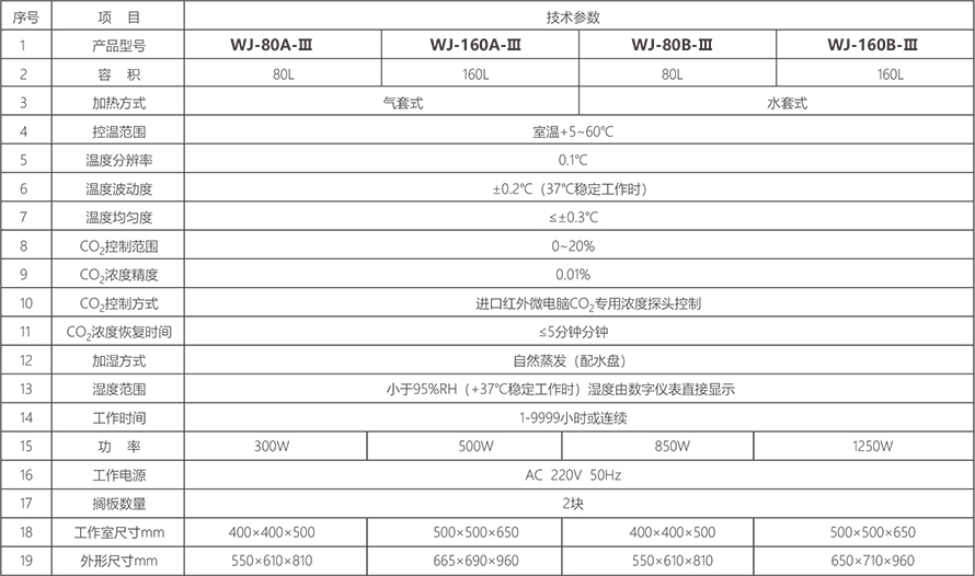 结构特点· 内胆采用优质不锈钢材料制成,具有耐腐蚀、耐酸、容易清洁、不生锈等特点。· 微电脑智能温控仪,P.I.D.控制,控温稳定、精度高,LED高亮度数字显示,直观清晰。具有超温声光报警功能,超温报警的温度设定值可调整,培养箱内温度值超过设定值0.5℃时报警,并切断加热回路。双层门结构:外门开启后,透过由高强度钢化玻璃制作成的内门观察工作室实验情况,温度、湿度不受影响。· CO2浓度传感器采用芬兰原装进口红外探头,能直接显示箱内CO2浓度,运行可靠。· 独立设置的门加热系统,能有效避免内门玻璃上的结露现象,防止由于玻璃内门冷凝水带来微生物污染的可能性。· 工作室内采用水盘自然蒸发加湿,湿度由仪表直接显示。· 箱内装有紫外线杀菌灯,可定期对培养室进行紫外线消毒,从而更有效防止细胞在培养期间的污染。· 独立限温报警系统,超过限制温度立即自动中断,保证实验顺利进行(选配)。· CO2进气口配备高效微生物过滤器,可有效过滤直径大于3μm的颗粒,过滤效率达到99.99%,有效过滤CO2气体中的细菌及灰尘颗粒( 选配)。技术参数