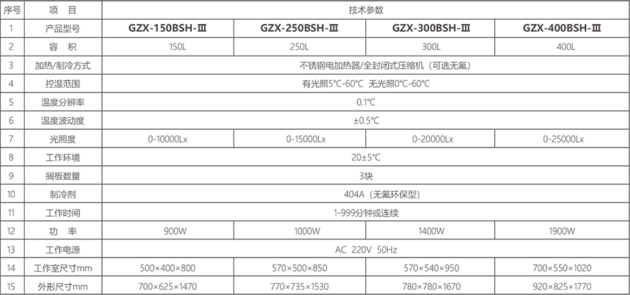 结构特点· 内胆采用优质镜面不锈钢材料制成,具有耐腐蚀、耐酸、容易清洁、不生锈等特点。· 微电脑智能温控仪,P.I.D.控制,控温稳定、精度高,12位LED高亮度数字显示,直观清晰,具有良好的控制能力和抗干扰能力。双重温度保险装置:温控仪具有自动跟踪、超温报警装置;一旦超温立即切断加热系统,同时在工作室内装有温度保险装置,可确保工作室内培养物的安全。· 工作室独特的风道设计,风速柔和,确保箱内温度均匀性和精确性。· 三面光照设计,光照度五级可调,模拟白天黑夜环境。· 双层门结构:外门开启后,透过由高强度钢化玻璃制作成的内门观察工作室实验情况,温度不受影响。· 工作室内搁板可随意调节高度。· 独立限温报警系统,超过限制温度立即自动中断,保证实验顺利进行(选配)。· 可配打印机或RS-485接口,连接计算机记录试验参数变化状况(选配)。技术参数