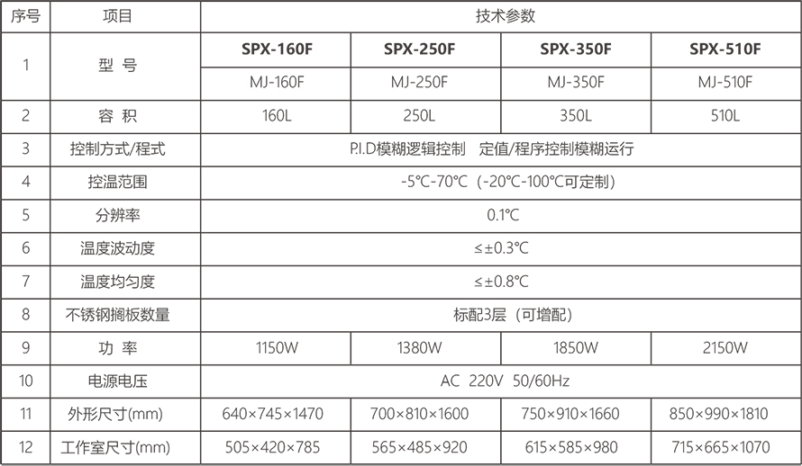 结构特点· 本产品造型新颖、美观。工作室采用优质 304不锈钢材料制作,四角圆弧设计,易清理;外壳采用优质冷轧钢板制作,表面静电喷塑处理,耐腐蚀性强;双层门结构,内门为优质钢化玻璃门,可直接观察工作室内试验情况而不影响内部温度;独特风道设计,确保工作室内部温度均匀稳定;不锈钢搁板,高度可自由调节。· 真彩液晶触摸屏,温度、时间实时显示,具有人机操作界面, 操作简便,更具人性化;可查看仪器历史记录数据。· 采用智能操作系统,模糊 P.I.D智能控制,定值/程序多段运行可自由设置。配备大容量内存,可存储25万条数据记录和16000条事件记录。· 具有中英文菜单切换功能。· 用户权限分级管理:管理员最多可创建5个子用户,并分配不同权限,可实现多级管理。· 可自动记录设备的运行数据、操作日志和报警日志,且可通过仪表U盘接口导出原始文件或不可更改的PDF文件。· 屏幕密码锁定功能, 可防止非实验人员随意操作。· 内置高亮度LED照明灯、紫外线杀菌灯(限MJ-N系列);箱体一侧带有测试孔(50mm),方便进行数据验证。· 变频式制冷系统,节能节水,温度波动小,开门恢复快,并确保设备在非极限条件下长期无霜运行;选用国际知名品牌压缩机,环保型无氟制冷剂。来电恢复模式可选:停止、重新开始运行、继续运行。· 可配备嵌入式微型打印机:实时打印试验数据,打印时间间隔可自行设定。(选配)· 4G智能物联网关或WiFi智能物联网关,通过微信小程序可实现7*24小时远程智能监控。可进行报警推送,监测设备运行状态,历史数据及曲线查询,并可导出PDF文件。(选配)· 短信报警模块:GPRS手机短信报警(通过通讯软件发送到指定的手机上,确保测试过程安全性)。(选配)· 可提供3Q验证服务。技术参数