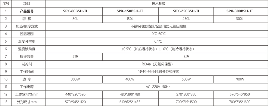 结构特点· 内胆材料采用优质镜面不锈钢材料制成,具有耐腐蚀、耐酸、容易清洁、不生锈等特点。· 微电脑智能温控仪,P.I.D.控制,控温稳定、精度高,7位LED高亮度数字显示,直观清晰,具有良好的控制能力和抗干扰能力。双重温度保险装置:温控仪具有自动跟踪、超温报警装置;一旦超温立即切断加热系统,同时在工作室内装有温度保险装置,可确保工作室内培养物的安全。· 双层门结构:外门开启后,透过由高强度钢化玻璃制作成的内门观察工作室实验情况,温度不受影响。· 工作室内装有照明日光灯;BOD插座(限150L及以上);工作室内搁板可随意调节高度。· 工作时间设定范围:1分钟-99小时59分钟。· 独立限温报警系统,超过限制温度立即自动中断,保证实验顺利进行(选配)。· 可配打印机或RS-485接口,连接计算机记录试验参数变化状况(选配)。技术参数