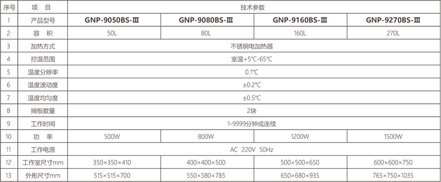 结构特点· 双层门结构:打开箱门,内门由优质保温钢化玻璃制成,便于观察工作室内情况,且不影响内部温度。· 水夹套结构(培养箱水套采用优质不锈钢材料氩弧焊焊接而成):温度均匀,断电后仍能保持较长时间的恒温状态。· 双重温度保险装置:温控仪具有自动跟踪、超温报警装置;一旦超温立即切断加热系统,同时在工作室内装有温度保险装置,可确保工作室内培养物的安全。· 采用微电脑智能温度控制仪表,P.I.D.控制,具有自整定功能,LED高亮数码管显示,清晰直观。设定温度后,仪表自行判断加热所需功率,并显示加热状态,无温度过冲之弊,控温精确而稳定。具有断电自动恢复记忆功能。· 内胆采用优质镜面不锈钢材料制成,圆角造型,具备耐腐蚀、耐酸、易于清洁等特点。· 工作方式:连续或1~9999分钟定时功能。· 独立限温报警系统,超过限制温度立即自动中断,保证实验顺利进行(选配)。· 工作室可配紫外线杀菌装置或照明灯(选配)。技术参数