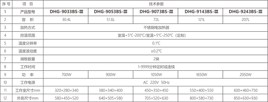 机构特点· 微电脑智能P.I.D.控制器,设定温度后,仪表自行控制加热功率,并显示加热状态,控温精确而稳定。· 超温声光报警并自动切断加热电源。· 内置两层不锈钢搁板,高度可自由调节。 用料:· 箱体采用优质冷轧钢板,表面静电喷塑,涂层坚硬牢固,具有极强的防锈能力。工作室为材料优质304镜面不锈钢制作而成 ,箱内圆角造型,光滑流畅,极易清洁。搁板支架可自由装卸。· 低噪音专用风机,能在高温下长时间稳定运行;可调式新型进风口,控制箱内进出的空气量。· 独立限温报警系统,超过限制温度立即自动中断,保证实验顺利进行(选配)。· 可选多段程序控制器,方便长时间多温度点试验(选配)。· 可配打印机或RS-485接口,连接计算机记录温度等参数变化状况(选配)。技术参数