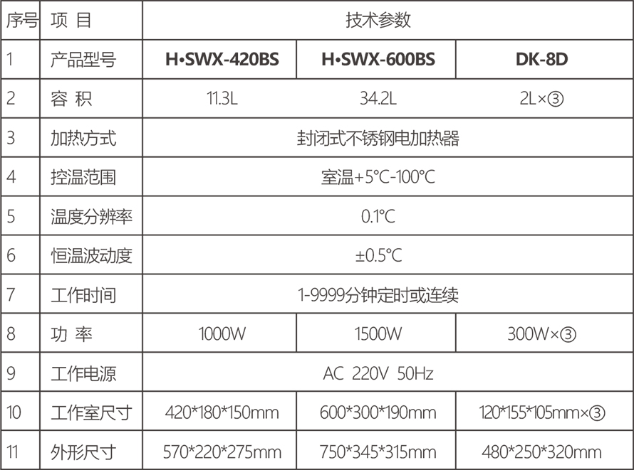 DK-8D三孔电热恒温水槽外壳采用优质冷轧钢板喷塑而成。内胆及顶盖采用不锈钢材料,造型新颖、美观;三孔独立控制温度;控温仪采用高速、高性能CPU处理芯片,高灵敏、高精度铂电阻传感器,具有超温声光跟踪报警,使样品得到可靠保护。技术参数